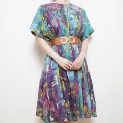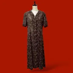 昭和レトロストライプ柄半袖ロングワンピース腰ヒモ付き透け素材ネイビー古着