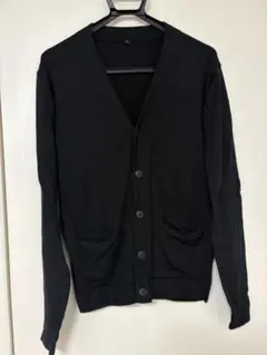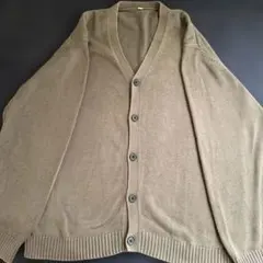 ニット素材のグレーのカーディガン、前面ボタン付き。