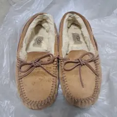 スエード素材のピンクモカシン、内側はふわふわのファーで快適な履き心地。