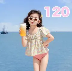フリル付きオフショルダーのピンク水着、帽子付き。