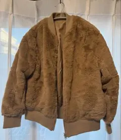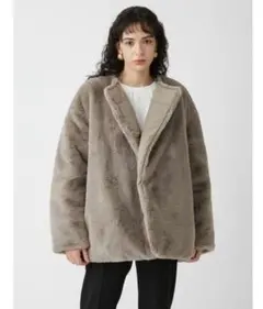 柔らかいファー素材のグレーコート、カジュアルなノーカラーで着回しやすいデザインです。