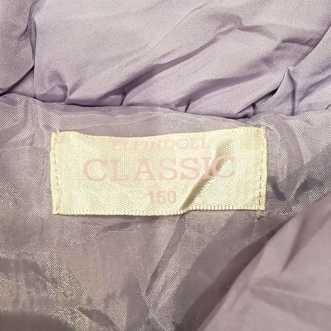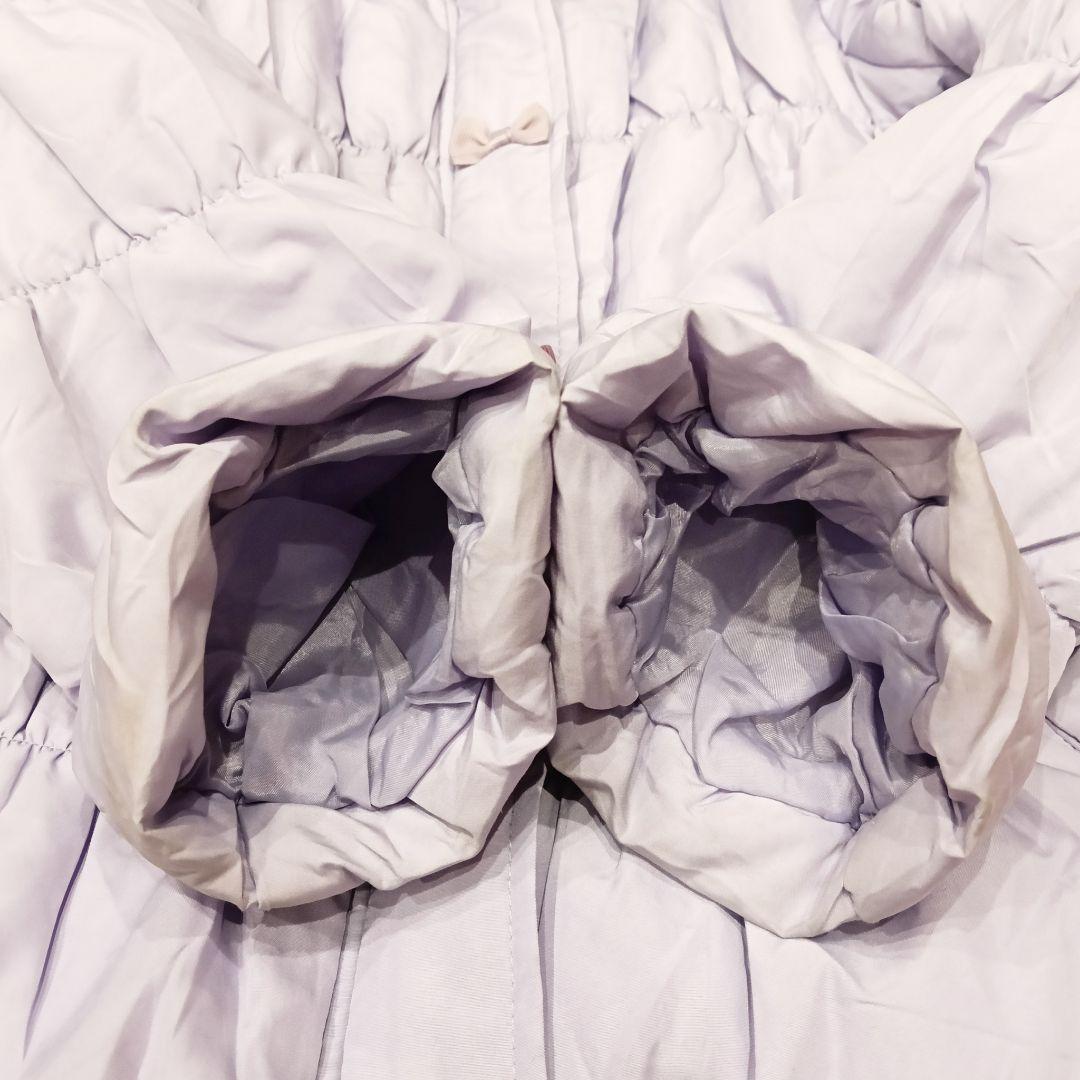 薄紫のフリル付き中綿コート、リブ袖で暖かさを保ちます。