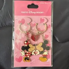 ミッキーとミニーのデザインが施されたピンクとシルバーのメタル製キーホルダー。
