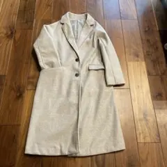 茶色、ダブルブレストロングコート、ウエストベルト付きでスタイリッシュ。