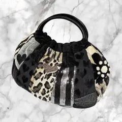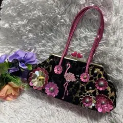 ハートモチーフの刺繍が施されたピンクのハンドバッグ。