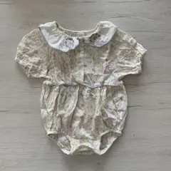刺繍入りのアイボリー色ロンパース、フリル袖デザインで可愛らしいスタイル。