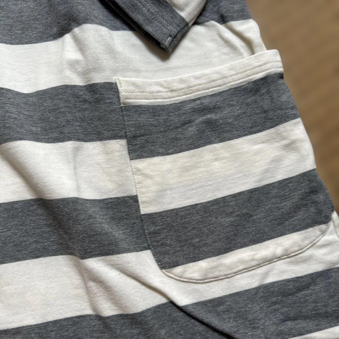グレーとホワイトのストライプデザインのロングスリーブドレス、両サイドポケット付き。