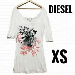 DIESELのグレーUネックTシャツ、七分袖、プリントデザイン。