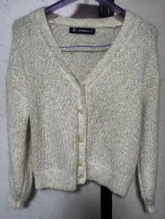 前面にポケットがあり、シンプルなデザインの長袖カーディガン。