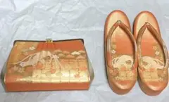 華やかな席に映える、ゴールドに花柄が美しい和装バッグと草履のセットです。