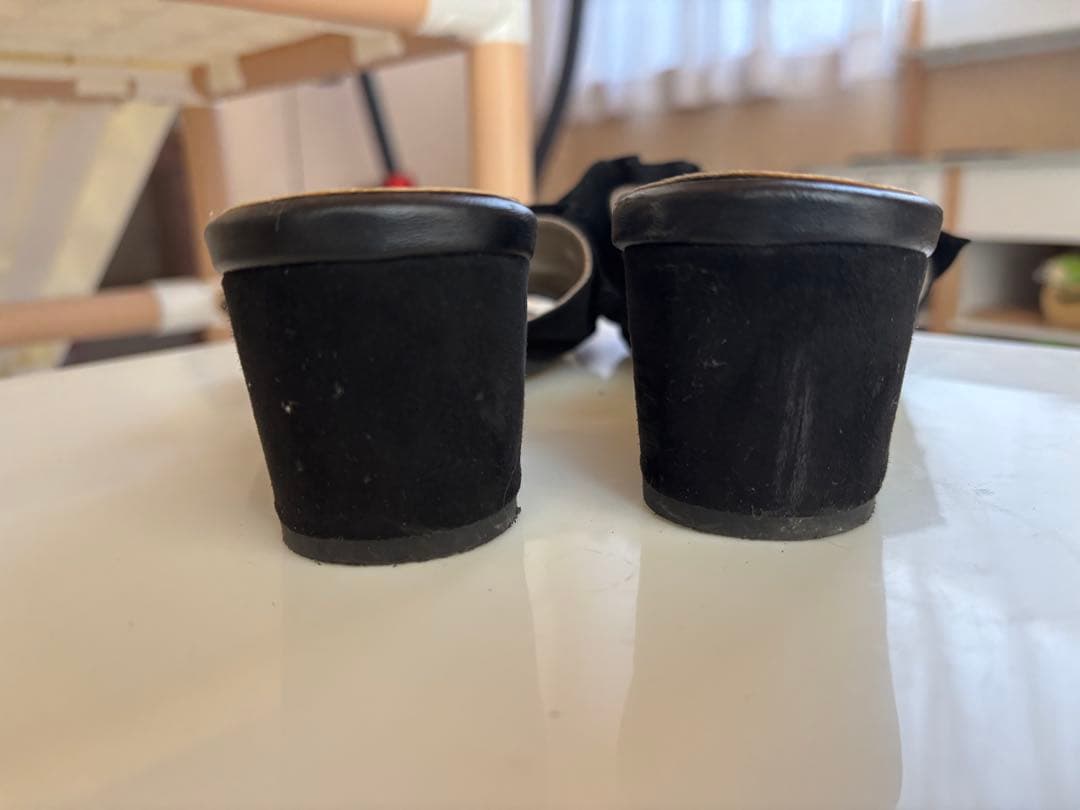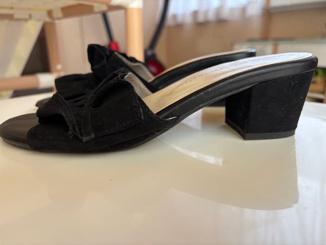フリルデザインのブラックサンダル、快適な中ヒール。