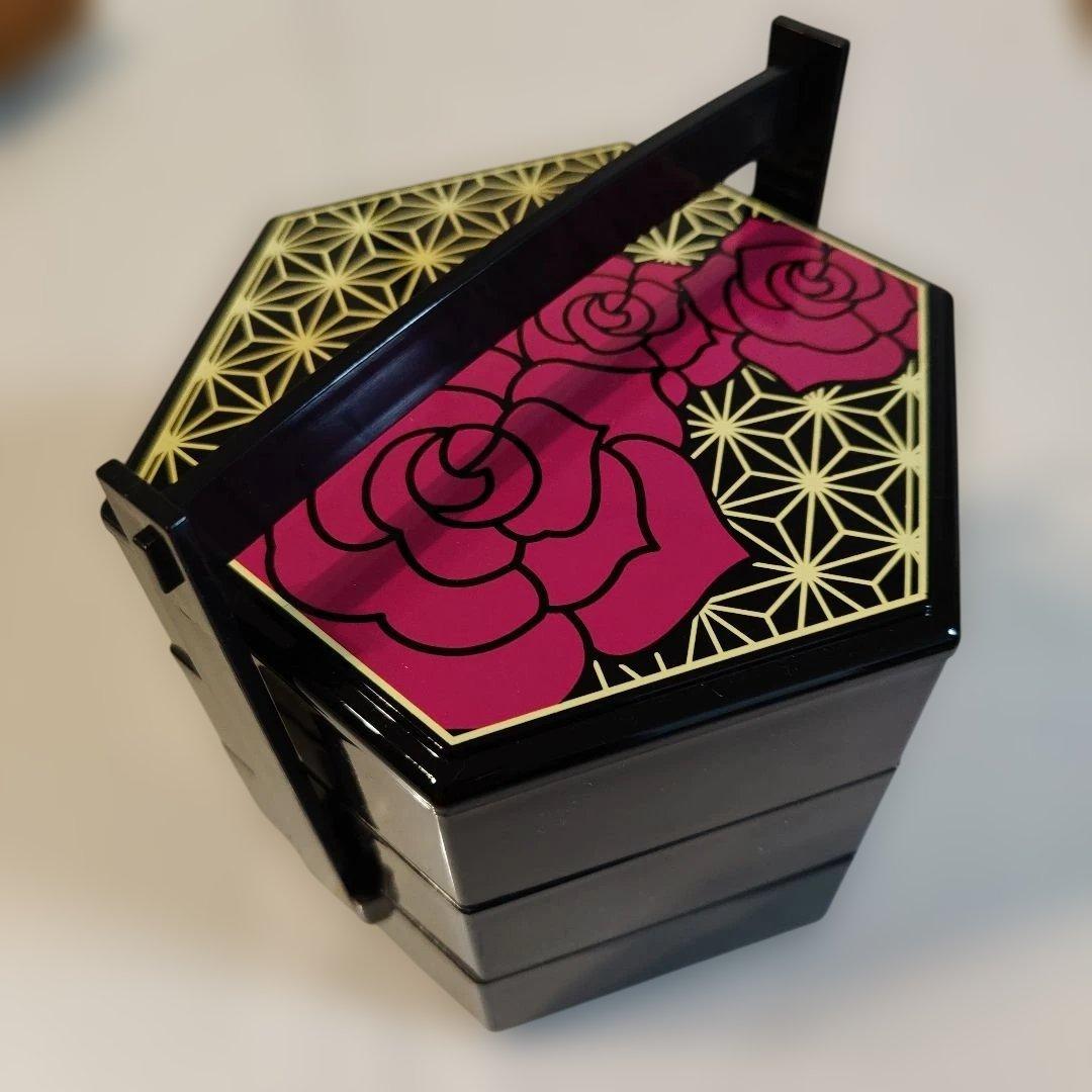 バラの花柄が施された六角形の漆器風重箱、3段構成で収納に便利。