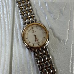 シルバーとゴールドのコンビネーションで、ダイヤルにストーン装飾が施されたCYMAのクォーツ腕時計。
