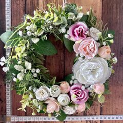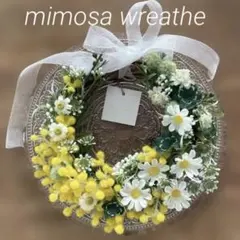 こちらのリースはミモザの珍しいブルーブッシュとデアネイの2種類の葉とミモザの花とレモンとドライフラワーを使いホワイトのシフォンリボンを結んで爽やかなミモザのリースに仕上げました♪(リボンは下に付けても可愛いです♡写真5枚目参考)