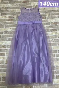 アイボリーのレースとサテンのノースリーブフォーマルドレス、ウエストにリボン付き。