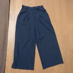 ダークブルーのワイドパンツ、ゴムウエストで快適な着心地。