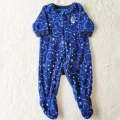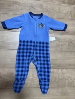 青と白のストライプデザイン、ミッキーの刺繍付きのフリースロンパース。