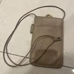 ベージュのレザー風スマホショルダーバッグ、カードポケット付きで便利。