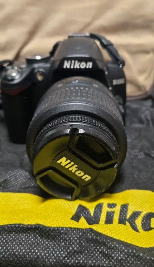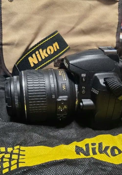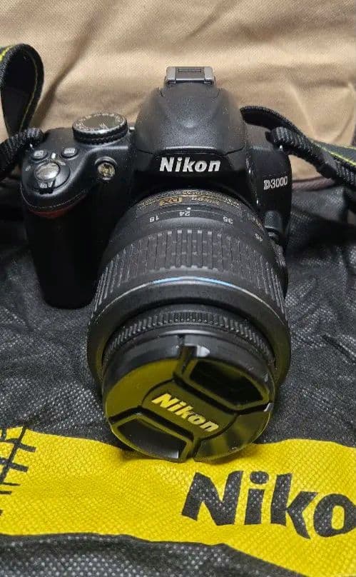Nikon D3000デジタル一眼レフカメラ、レンズキャップと充電器付き、専用バッグに収納。