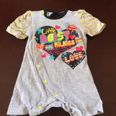 フードと耳付きのグレーのアクリルロンパース、木製ボタン付きの編み物デザイン。