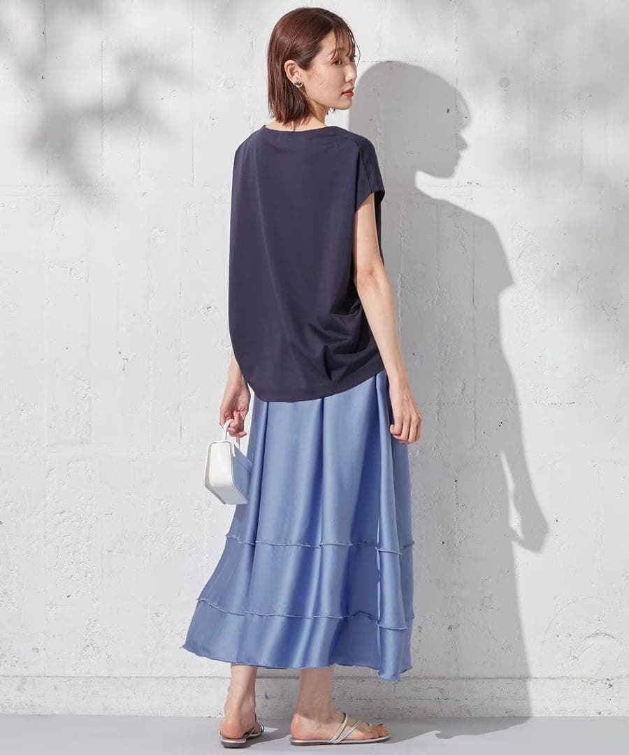 円状に広がる サーキュラーシルエットを意識した上品な光沢感のスカートです。切り替えのラインを強調したヨコの接ぎがポイントです。あえて切り替え部分を際立たせた大胆で美しいシルエットが大人の甘さを漂わせます。素材の落ち感でアシメントリーのような動きのあるシルエットに見せてくれます。光沢ある素材なので見た目も軽やか。ウエスト周りは立体的にタックとギャザーを入れることですっきり見えする設計です。コンパクトなトップスともボリュームのあるトップスとも相性抜群です。軽やかな素材ですがペチコートが付いているので透ける心配もありません。