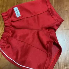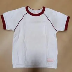 長袖の白い体操服、赤いストライプの襟付き、名前記入タグあり。