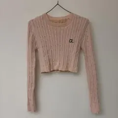 グレーとイエローのメッセージプリントニット、クロップド丈になります。