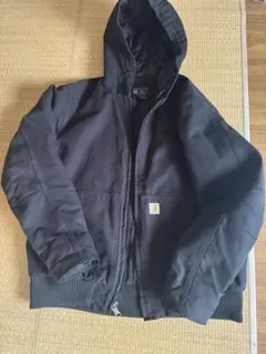 フード付きのブラックジャケット、フロントポケット付きで実用的。