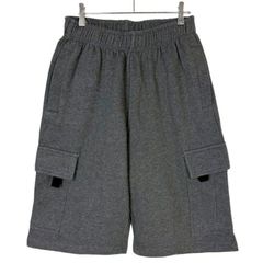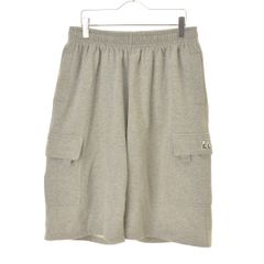 通気性のあるグレーのショートパンツ、調節可能なベルトとジッパーポケット付き。
