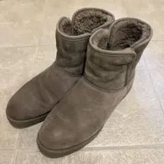 スエード素材のブラウンムートンブーツ、シープスキン裏地で快適。