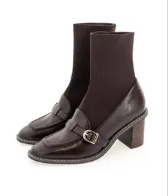 スエード素材のグレーショートブーツ、バックル付きでスタイリッシュ。