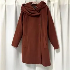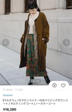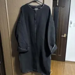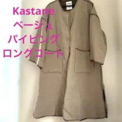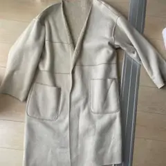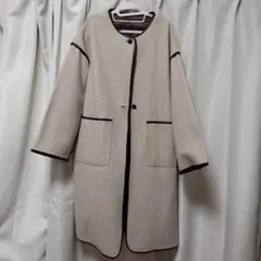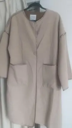 シンプルなデザインのベージュロングコート、前面ポケット付きで実用的。