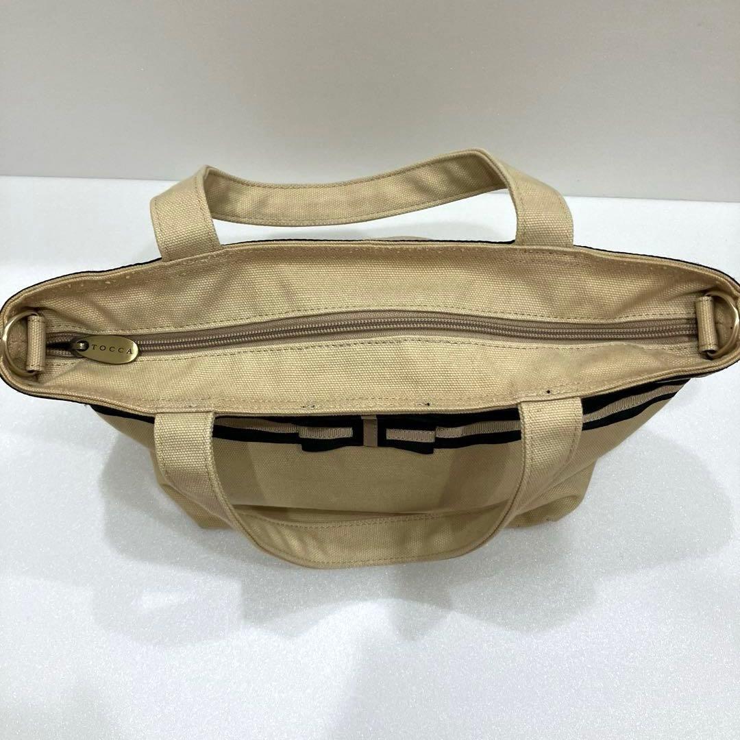 ・TOCCAらしい上品なデザイン: ベージュのキャンバス生地にブラックのストライプとリボンがアクセントになった、TOCCAらしいエレガントで洗練されたデザインです。カジュアルすぎず、お出かけシーンにもぴったり。