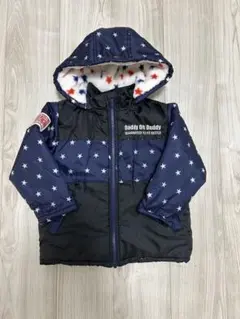 フード付きで暖かいダウンコート、120サイズ、ネイビー。