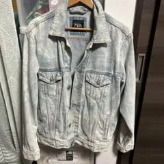 ライトブルーのダメージ加工デニムジャケット、前面ボタン留め、ポケット付き。