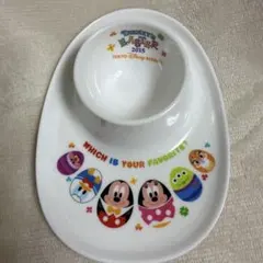 アイスクリームとイチゴのイラストが描かれた、白と赤のストライプの皿。