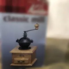 木製の手挽きコーヒーミル、クラシックなデザインで使いやすい。
