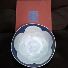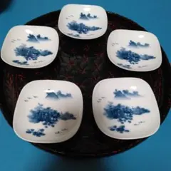 画像の大皿には、山や橋、家屋、船などが描かれた日本の風景が染付で表現されています。
