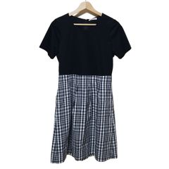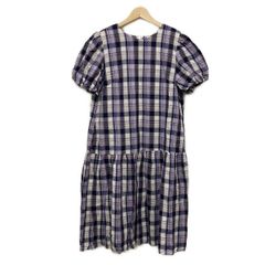 ドット柄のベージュVネックワンピース、半袖、ウエストにギャザーがありゆったりしたワンピースです
