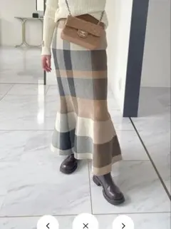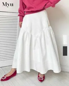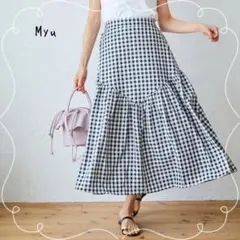 ブラックとホワイトのチェック柄のフレアロングスカート。チュール素材で軽やかな印象。