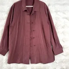 バーガンディ色のアシンメトリックデザインで、パールネックレスが付いた長袖シャツ。