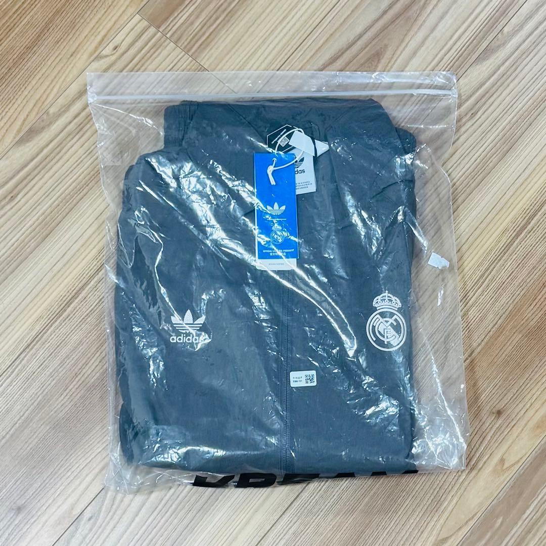 チャコールグレー系の落ち着いた色味に、胸元のadidasロゴとレアルマドリードのエンブレムが映える一枚。