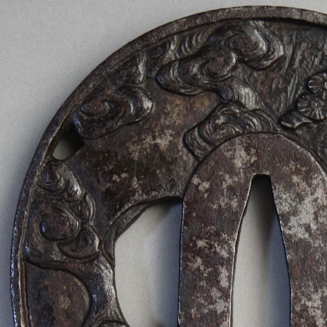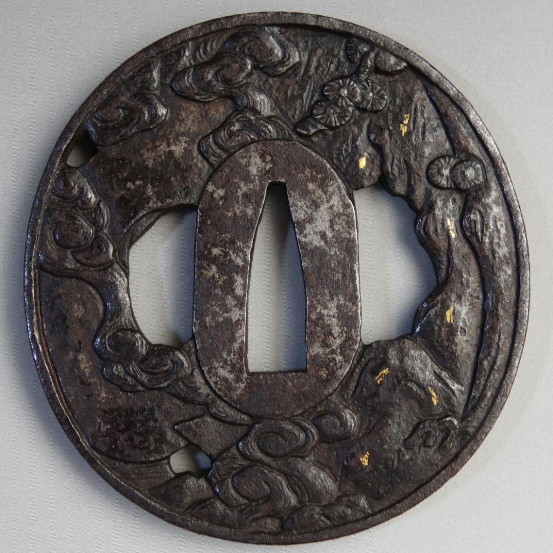 鉄地に、岩窟で賢人が巻物を読む図が彫り込まれた鍔です。