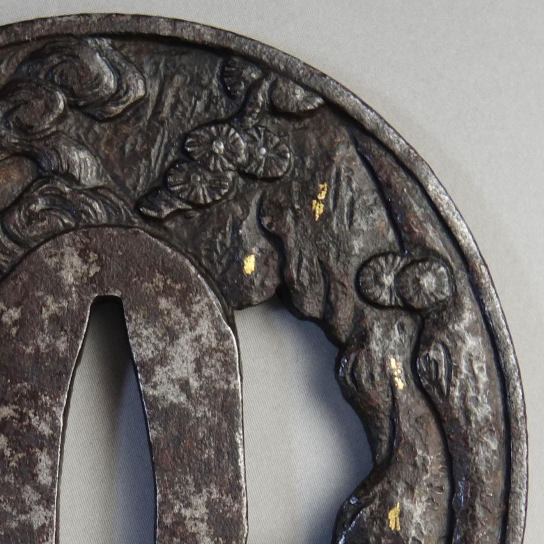 鍔 鐔 鉄地 刀装具 日本刀 武具 骨董【銅象嵌 岩窟賢人巻物図鍔】
