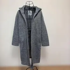 柔らかいフリース素材のグレーのロングコート、オープンフロントデザインで快適な着心地。
