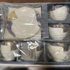 青いラインの装飾が施されたKANSAI製の陶器カップとソーサーのセット。