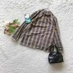 ネイビーとホワイトのチェック柄、リボン付きの長袖シャツ。