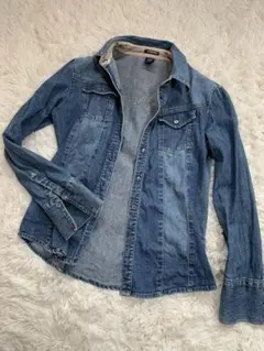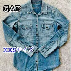 GAPのライトブルーデニム長袖シャツ、フロントポケット付きでカジュアルに最適。
