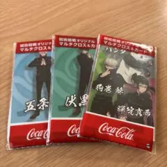 Coca-Colaのキャラクターグッズ、五条悟、パンダ、悠仁のデザインが特徴。
