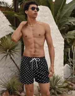 白と黒の幾何学模様の膝上丈水着、ドローストリング付き。